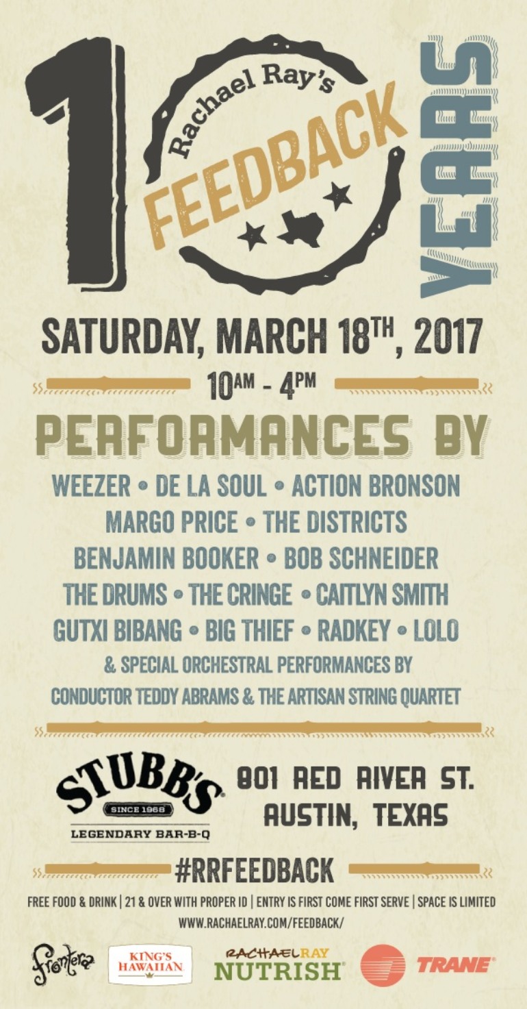 Finally one of my favorites has just dropped their lineup! Rachael Ray is coming back to Austin to host her 10th annual Feedback party. This party has everything, free drinks, free amazing food designed by Rachael herself, and one of the best lineups of the festival. Come groove with Weezer, De La Soul, Benjamin Booker, and more! Get the full lineup below.