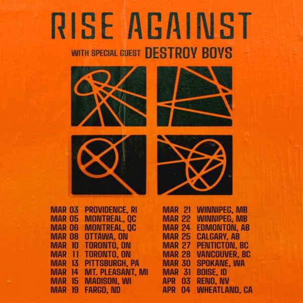Today, the Chicago based alternative punk rock band Rise Against has announced they will be headlining a handful of dates across Canada and the U.S. in the Spring of 2026 with Destroy Boys. The tour kicks off in Providence, RI, at The Strand on March 3, 2026 and will bring the band’s signature sound and socially conscious music to stages across North America, including Toronto, Montreal, Vancouver, Pittsburgh, Madison, Spokane and other states. For tickets and more information, click here.